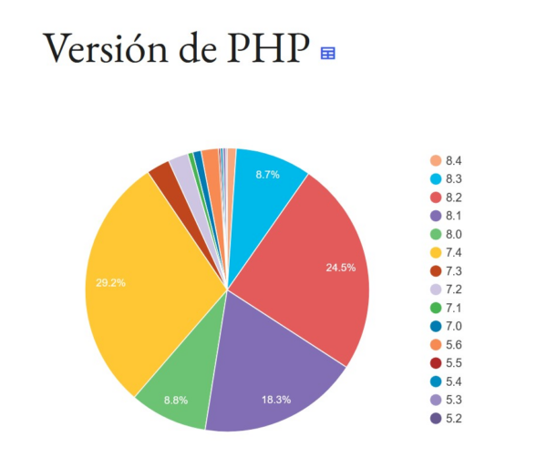 Estos datos confirman que más de la mitad de los sitios ya usan PHP 8.x, y que PHP 7.4 sigue presente con ~22%. En cambio, PHP 7.2 y 7.3 juntos suman poco más del 4%, por debajo del umbral del 5% usado para decidir el cambio.